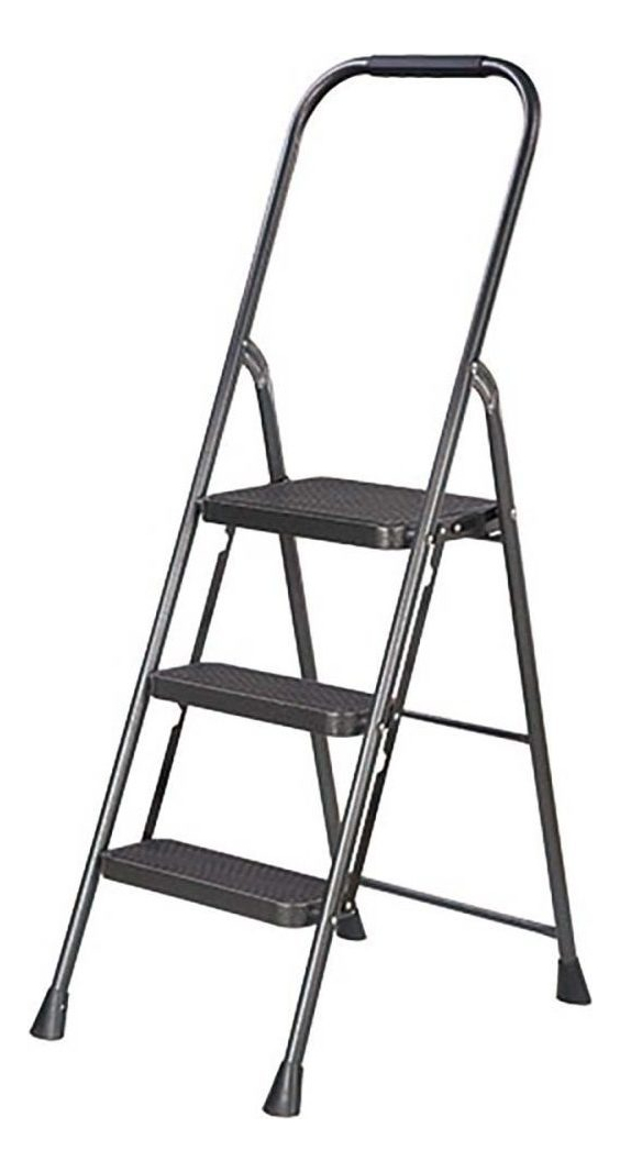 Escalera gris plegable con estructura tubular de acero. 3 peldaños con superficie antideslizante. Acabado martillado de pintura en polvo. Empuñadura engomada para fácil manipulación. Patas con puntas engomadas para mejor tracción y estabilida. Liviana. de fácil transporte. Capacidad máx de carga: 102 kg. Uso doméstico. Dimensiones: 48.9 x 61 x 128.9 cm.