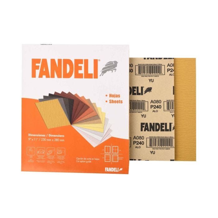 Lija en estereato de grano 240 fandeli. ideal para lijado de madera. se puede utilizar en máquinas de lijado o manualmente. marca fandeli