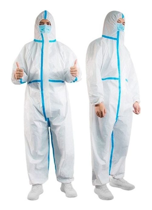 Traje esterilizado de color blanco para uso médico. traje de polipropileno esterilizado con capucha y cierre frontal. diseño de cuello alto cubre cierre con velcro. talla l.